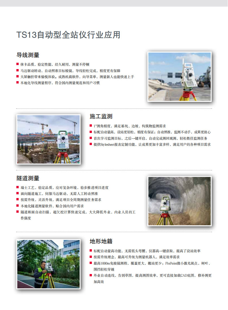 1”測角,1mm+1.5ppm測距,滿足測繪、施工全周期應用需求,標配自動量高,愉悅測量體驗徠卡測量全站儀產品擁有豐富的測量解決方案,經過長期的積累,無論基礎測繪還是工程測量,或者是監測檢測,亦或是特種測量,我們都有合適的解決方案供您選擇。