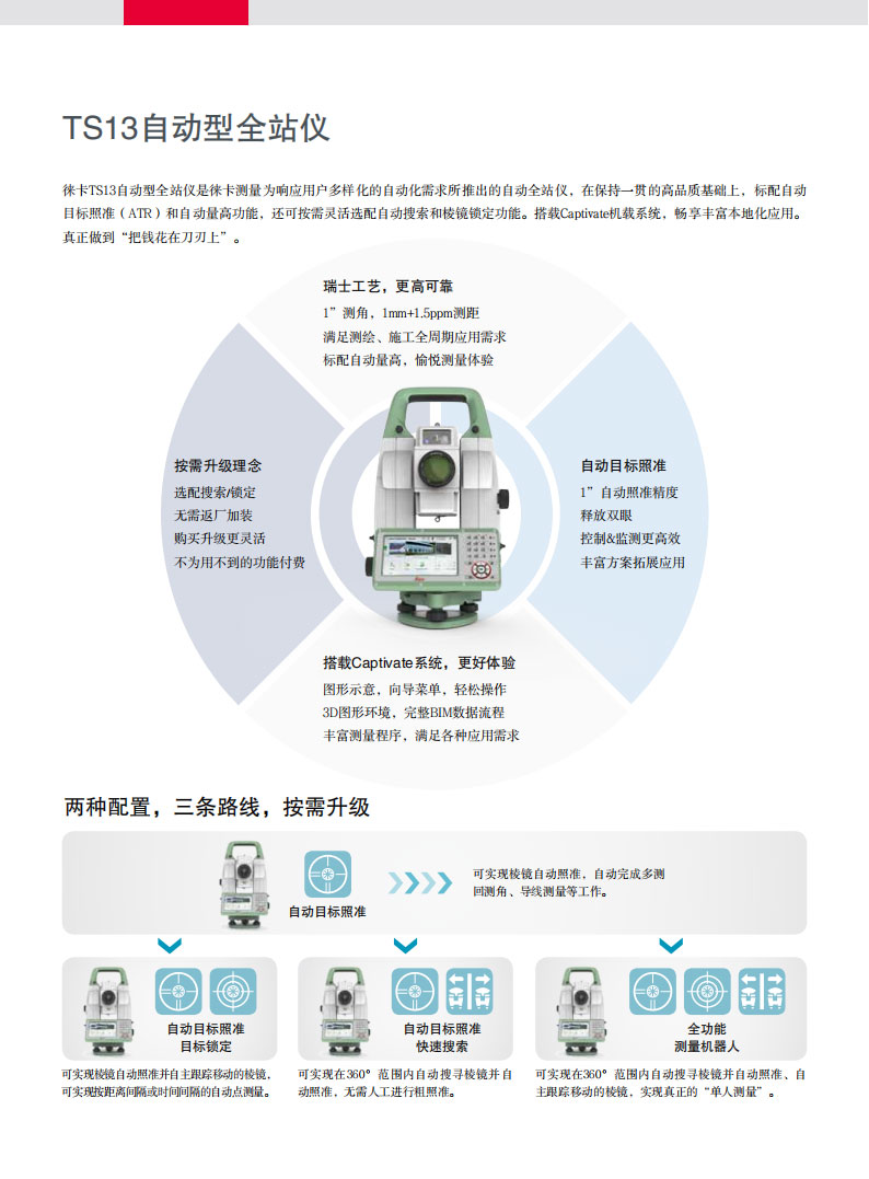 徠卡TS13自動型全站儀標配ATR自動照準技術,無需人工瞄準,儀器自動瞄準目標,照準精度與全站儀角度精度相同,避免人為錯誤,降低疲憊風險